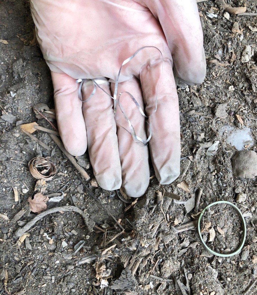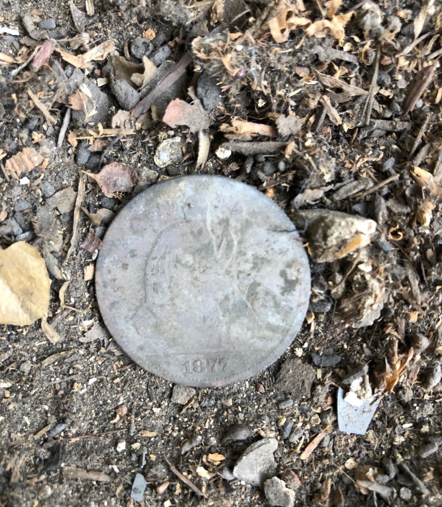 The upside of finding historic rats’ nests? They can be a treasure trove of artifacts which provide valuable insight into the history of the house and the people who once lived here. So, over Christmas, with the enthusiastic help of my mother (and I say that without a hint of irony), I started sorting through the rats’ nests. Donning gloves and masks, we carefully sorted through the dusty contents finding a range of artifacts from an 1877 Seated Liberty half dollar to a strand of tinsel, along with fragments of paper and fabric.