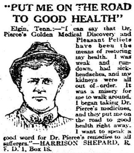 Or was it? In an interesting twist, Harrison Shepard underwent a dramatic makeover in 1922. While his testimonial remained unchanged, his appearance was updated to reflect current fashion and perhaps present a more sophisticated image. It did not last long – the final advertisement that I could find featuring Harrison Shepard endorsing Dr. Pierce’s remedies appeared in March 1923.