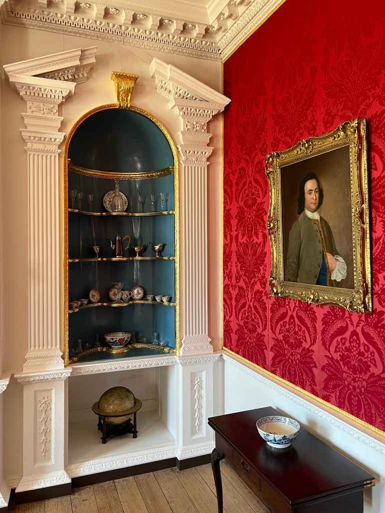 Original wallpaper did not survive, so period patterns were selected for the hallway (made by Waterhouse Wallhangings) and dining room which were recreated using period wood block printing methods. Fragments of red fabric were found under a tack in the parlor, so a red silk damask was installed on the walls there. The fireplace surrounds were altered over the years, but have been restored to match the original woodwork that survived and the niches (also known as bowfats or beaufats) in the parlor are original to the house. The portraits in the parlor of George Mason and his first wife Ann are the only known likenesses of them and are later copies of earlier works.