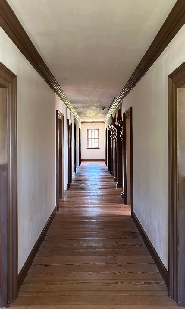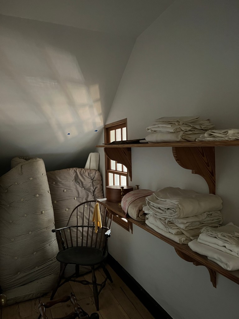 There are two stairways in the house – in between the little parlor and the bedroom is a narrow service stairway with steep stairs which would have been used by enslaved workers and servants and stands in stark contrast to the grand stairway in the entry hall. There were seven bedrooms and a storage room on the second floor and the areas which cannot be seen from the first floor are quite spare – no wallpaper, simple woodwork. There was a hierarchy to these rooms though – the bedrooms in the corners were larger and had fireplaces which would have made them more comfortable in the winter.